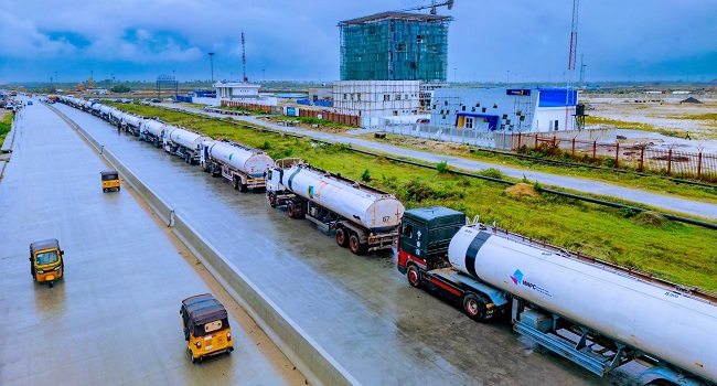 NNPCL trucks lining up for petrol loading at the Dangote Refinery. X/@nnpclimited